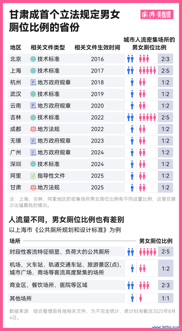 2016年,住房城乡建造部批准颁布新版《城市环球茅厕贪图纪律》,淡薄“东说念主流麇集的场所,女厕位与男厕位(含小便占位)的比例不应小于2∶1”。而后,多地在此纪律基础上,出台了我方城市东说念主流密集场所的男女厕位比例文献。